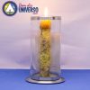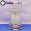 Suporte de vidro transparente com uma base de alumínio, como acabamento dois anéis também em alumínio na parte superior e inferior.
